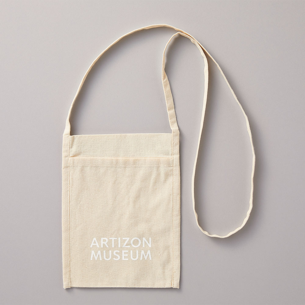 アーティゾン美術館のロゴがプリントされた軽量でコンパクトなオリジナルサコッシュ。マチが無い薄型デザインで、スマホなどを入れるなど、ちょっとした持ち運びに便利なサイズ。肩ひもは男性でも斜めがけができる長さです。表面と裏面に一つずつポケット付き。
