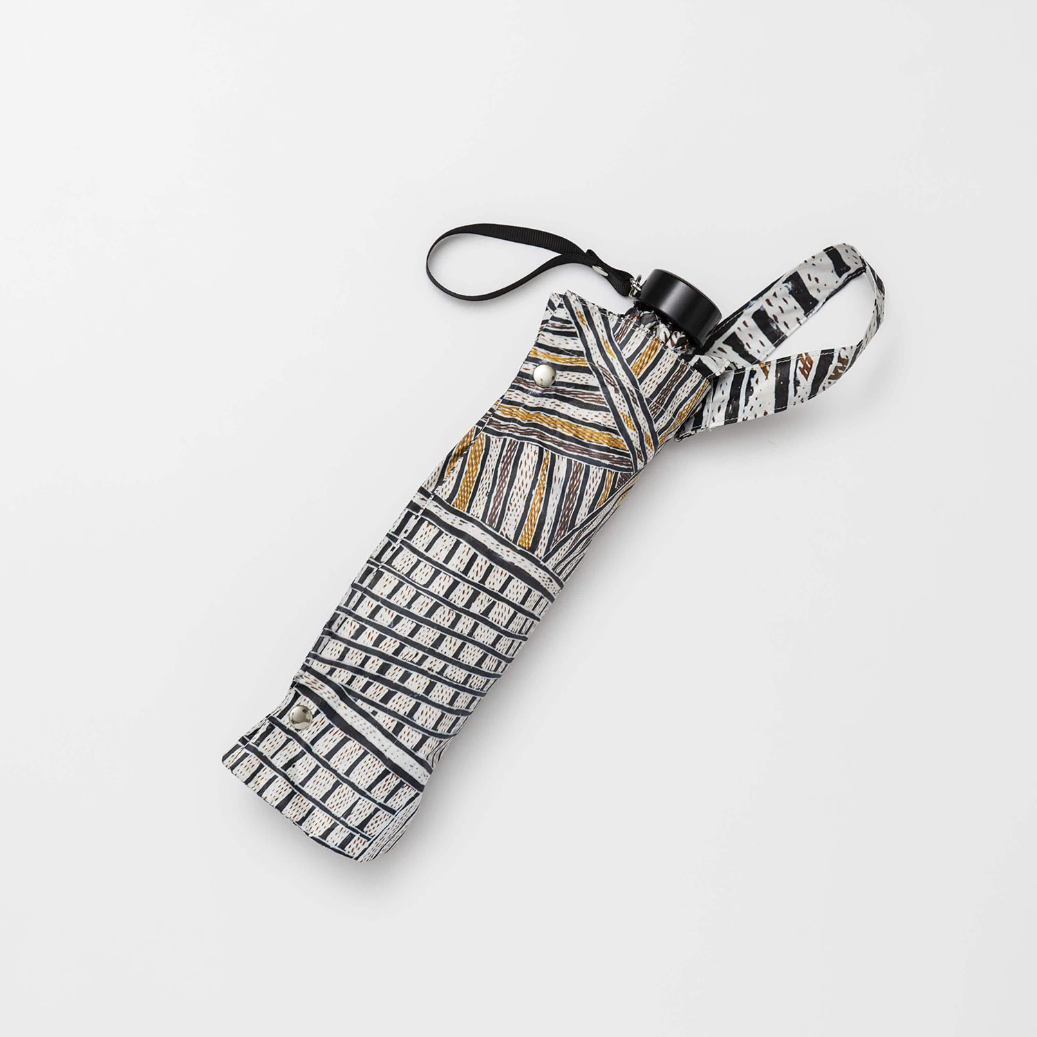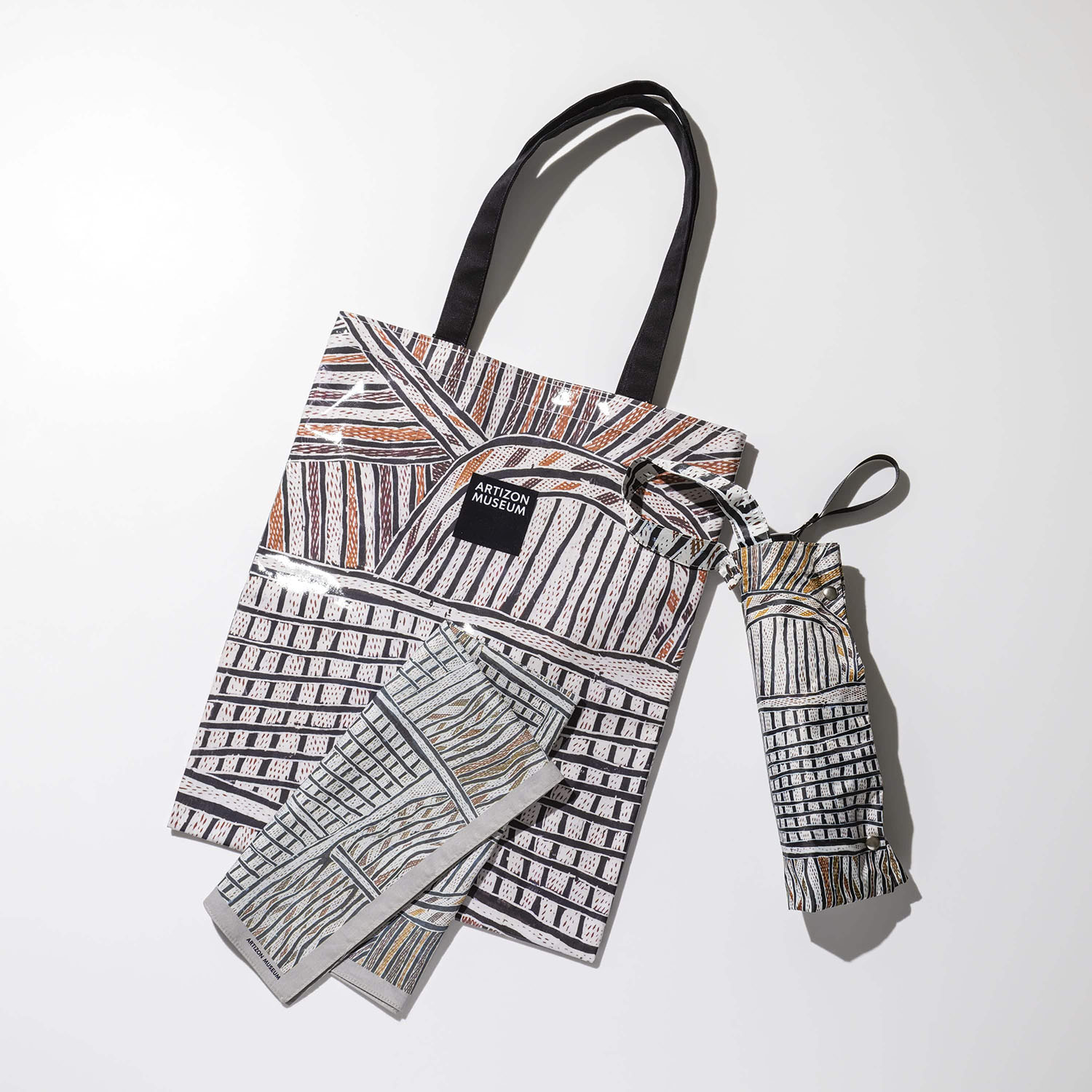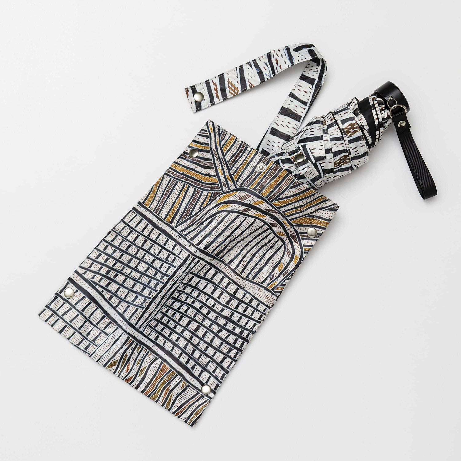 ノンギルンガ・マラウィリ《ボルング》をモティーフにしたオリジナルの折りたたみ傘です。全面プリントが目を引くアイテムで、日傘として、また雨傘としても外出も楽しくなるでしょう。付属の傘袋は取手部分がスナップボタンになっているため、バッグの持ち手などに取り付けて持ち歩くことができます。同じ作品をモティーフにしたフラットバッグとバンダナのセットでお楽しみください。