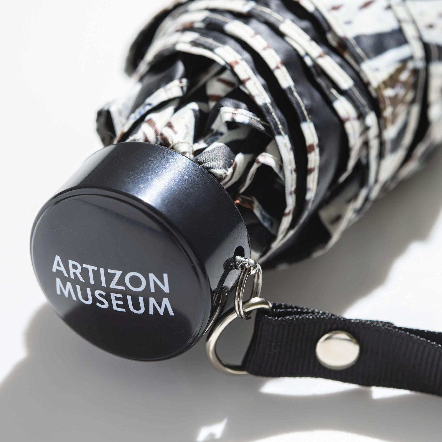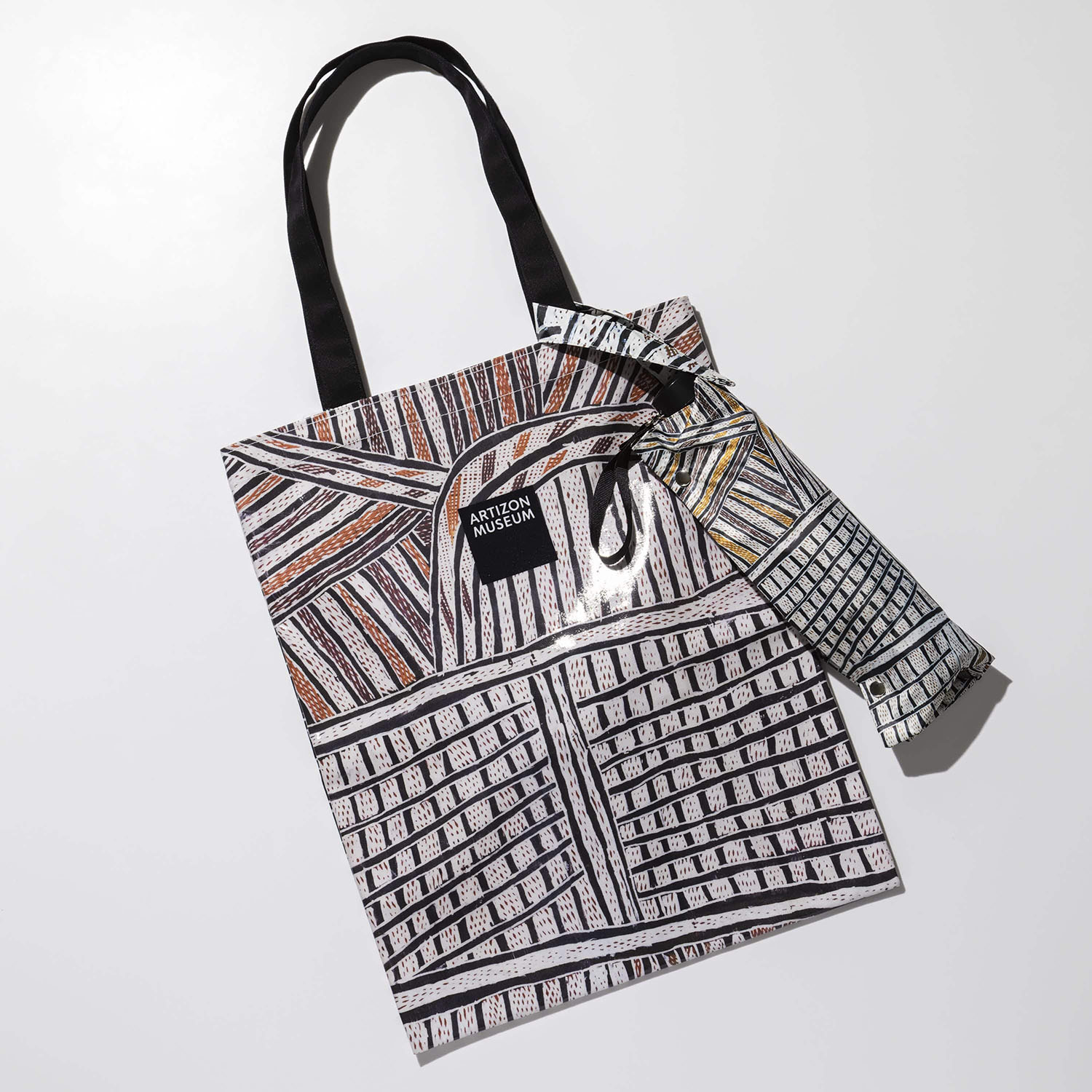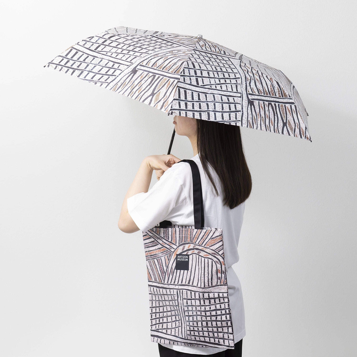 ノンギルンガ・マラウィリ《ボルング》をモティーフにしたオリジナルの折りたたみ傘です。全面プリントが目を引くアイテムで、日傘として、また雨傘としても外出も楽しくなるでしょう。付属の傘袋は取手部分がスナップボタンになっているため、バッグの持ち手などに取り付けて持ち歩くことができます。同じ作品をモティーフにしたフラットバッグとバンダナのセットでお楽しみください。